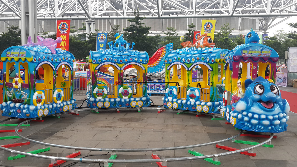 2、小火車是備受2-5歲小朋友喜愛的一款兒童游樂設施,海洋小火車擁有藍白相間的主色,就像藍天白云給人軟綿綿的感覺。滑行過程中車輪與軌道的摩擦,會使坐在車廂里的小朋友上下顛簸,更像是在大海中翻滾前行。車廂數量一般為4節,可供14人乘坐,車體采用優質玻璃鋼,耐磨韌性好,龍之盈游樂始終不忘初心,用質量說話,用產品樹立品牌。